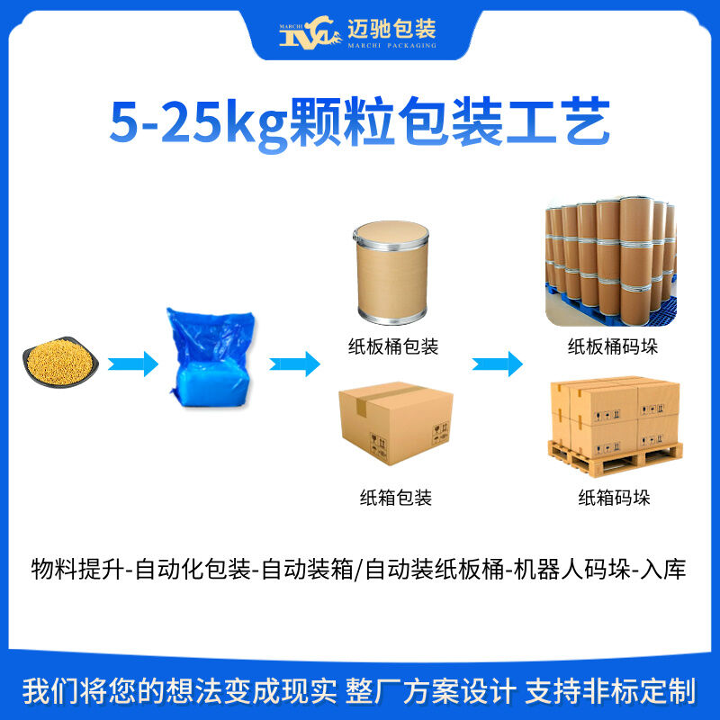 迈驰,是一家专业生产全自动5-25kg颗粒包装流水线的生产厂家,无扬尘、高精度,可根据物料不同特性定制包装流水线设备,一对一定制化服务,26年包装行业经验助力生产企业将本增效,提高产能。