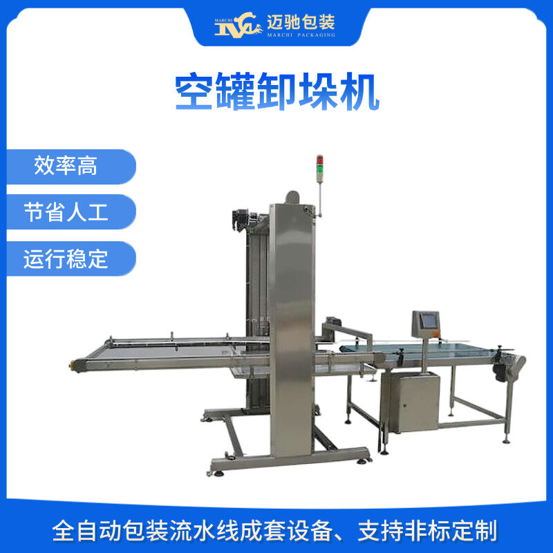 将一层一层的空罐送到理罐机上,应用于马口铁罐及铝罐的卸空罐作业整机主体框架不锈钢结构,部分传动轴碳钢电镀伺服马达和减速机驱动取罐装置升降PLC控制、触摸屏人机界面显示,操作简便。